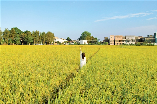 “风吹稻浪,遍地金黄”,在江门的乡村里,大片成熟的稻谷随风荡漾,连成一片金灿灿的稻海。