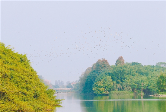 沿着小鸟天堂西侧生态步道进入新开发的迎鹭岛巴金亭区域,可以近距离观赏古榕树,鹭鸟齐飞的景象近在咫尺。