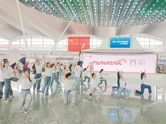 “白云机场江门宣传周”活动昨天(4月15日)启动,活动充分结合白云机场作为广交会参会客商进出核心航空枢纽的独特优势和侨乡江门独特的文化资源优势,以“江门三点三精彩之旅”为主题,向人们展示江门城市形象。图为快闪活动场景。