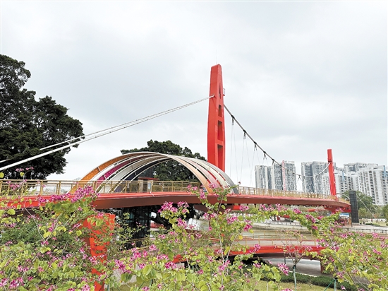 漫步下沙公园,沿岸美景尽收眼底,河畅、水清、岸绿、景美的动人画卷徐徐铺展。下沙公园与城央绿廊一脉相承,“四道”不间断、无障碍,串联起榕荫广场、咸水歌广场、观浪桥、下沙人行天桥、下沙文化展示活动中心、儿童乐园等功能区域,既保留独特疍家文化印记,又体现亲水特色。