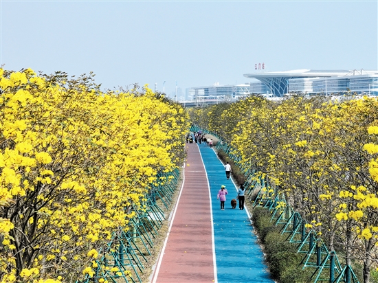 新会英洲海碧道的黄花风铃木吸引众多游客前来打卡。新会区融媒体中心供图