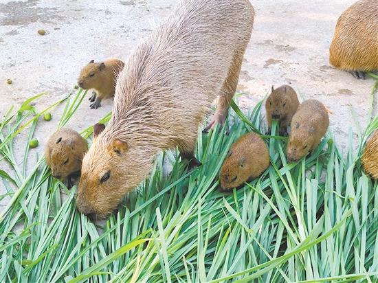 5月2日,带孩子来长廊生态园游玩的市民梁先生一家,刚好碰到了出来散步的水豚宝宝。“听说‘卡皮巴拉’生宝宝了,孩子们都很兴奋,一定要来看。刚开始可能人多,一直没看到它们出来。到了下午六点多,我们准备要走的时候,小家伙儿们才慢悠悠地出来了,太可爱了!”