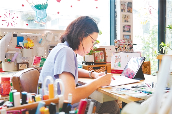 走进江门启明里斑驳的石湾直街的一幢老居民楼,这里便是李玉如的艺术工作室。工作室里桌面上堆满了画稿,展示架上则摆放了各式各样的原创文创产品,这里是她的创作天地,也是她向世界展示侨乡魅力的窗口。