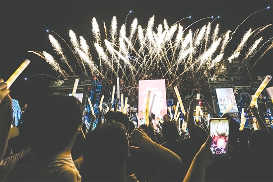 江门日报讯 (记者/李银换) 8月15日夜晚,赤坎华侨古镇上空烟花绚烂,香港组合农夫登台献唱,熟悉的旋律瞬间点燃现场氛围,游客挥舞荧光棒齐声合唱,度过了一个难忘的夜晚。
