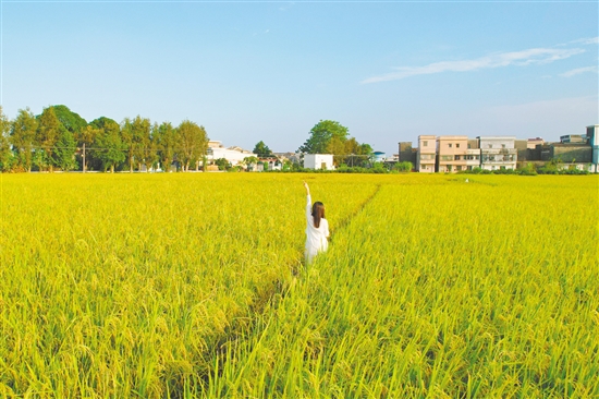 江门乡村稻田铺成金色画卷,吸引不少游客打卡。