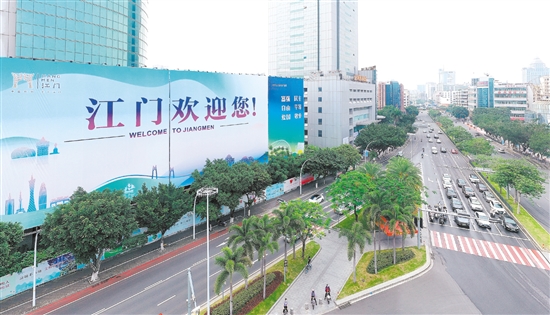 大湾区,开大会!昨天(5月15日),蓬江区建设路一处“江门欢迎您”的巨幅广告,看起来清爽怡人,预示着2023华侨华人粤港澳大湾区大会即将在江门举行。 郭永乐 摄
