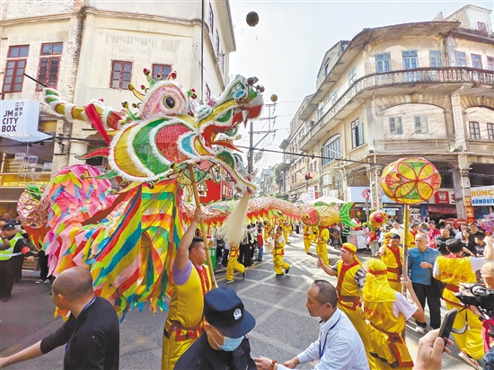 在巡演时,多条巨龙时而奔腾,时而穿梭,威猛逗趣,脚步生动活泼,踏出对新年的祝福和期待。值得一提的是,参与舞龙表演的有国家级非物质文化遗产荷塘纱龙。相比其他地方的舞龙,荷塘纱龙尤为灵活,讲究动作敏捷轻盈,龙舞变化迅速,对舞龙者的体力等要求比较高。