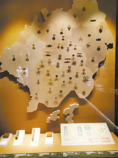 在中国侨都华侨华人博物馆“侨乡文教”展区,有一个江门市地图形状的展板,上面插满了民国时期五邑各地校徽。记者粗略数了一下,有近60枚校徽,形状各异,以圆形、三角形、长方形为主,地方则以台山、开平居多。有些校徽已看不清字迹,但却见证着百余年前五邑大地上教育的繁盛和兴旺。