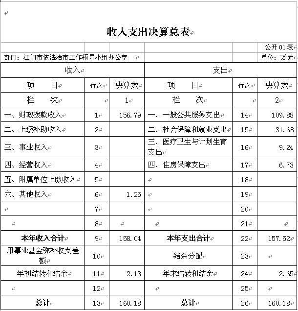 江门市依法治市工作领导小组办公室2015年度总收入160.18万元,其中本年收入158.04万元。具体情况如下: