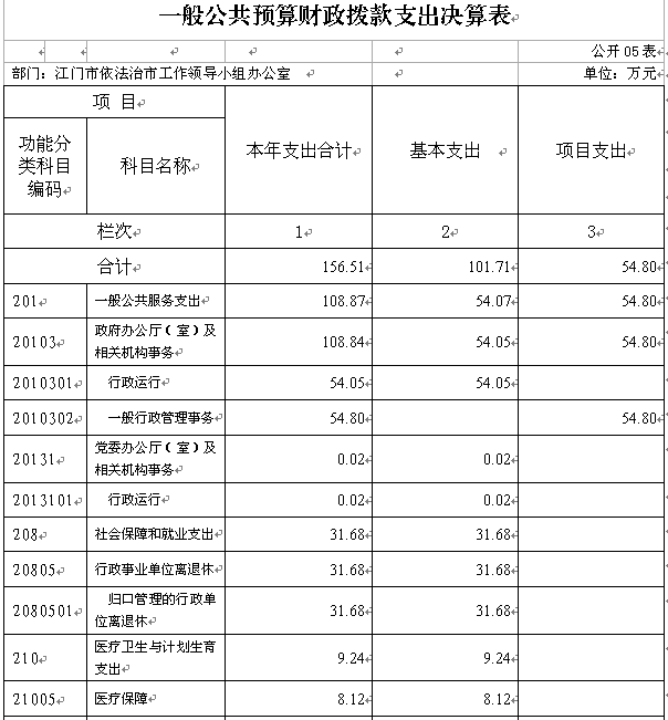 江门市依法治市工作领导小组办公室2015年度一般公共预算财政拨款支出156.51万元,具体情况如下:
