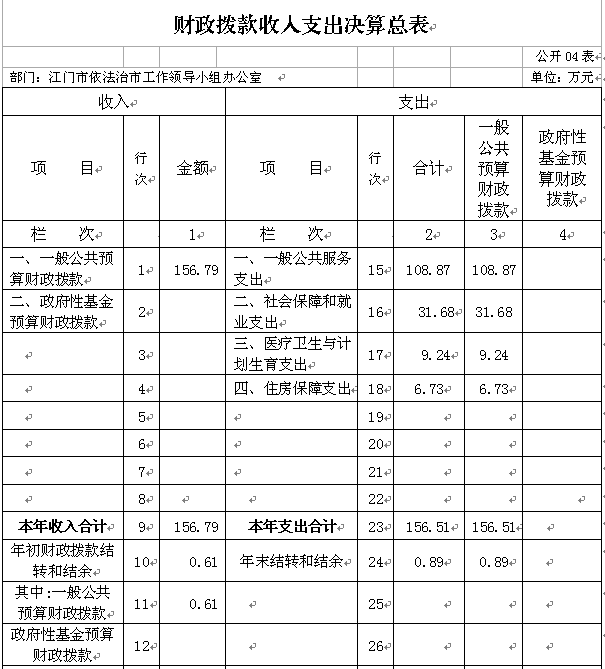 江门市依法治市工作领导小组办公室2015年度财政拨款收入合计156.79万元。其中:一般公共预算财政拨款收入156.79万元,比2014年决算数增加1.63万元,增长1.05%,基本与上年持平。