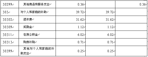 (三)对个人和家庭的补助39.72万元,占基本支出的39.05%。主要包括退休费31.62万元、奖励金1.12万元、住房公积金6.02万元、购房补贴0.71万元、其他对个人和家庭的补助支出0.25万元。
