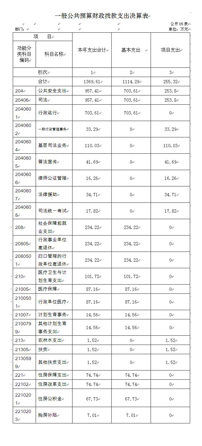 江门市司法局(部门名称)2015年度一般公共预算财政拨款支出1369.61万元,具体情况如下: