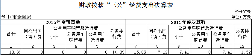 江门市人民政府金融工作局2015年度“三公”经费财政拨款支出决算为15.85万元,完成预算18.39万元的86.19%。其中:因公出国(境)费支出决算为7.12万元(预算为0万元);公务用车购置及运行维护费支出决算为7.41万元,完成预算8万元的92.63%;公务接待费支出决算为1.32万元,完成预算10.39万元的12.7%。2015年度“三公”经费支出决算小于预算数的主要原因是我局认真贯彻落实中央八项规定精神和厉行节约的要求,从严控制“三公”经费开支,全年实际支出比预算有所节约;其中,因公出国(境)费用支出大于预算数,原因是:根据“零基预算”原则,因公出国(境)经费实行切块管理,不列入本部门年初预算反映。在预算执行过程中,对经市外事管理部门审核同意安排出访经费的市直单位,由市财政部门在因公出国(境)经费总控制数的额度内统筹安排给出访单位使用,在决算时再按照实际使用情况归口到资金使用单位,由单位负责本部门因公出国(境)经费的决算公开。