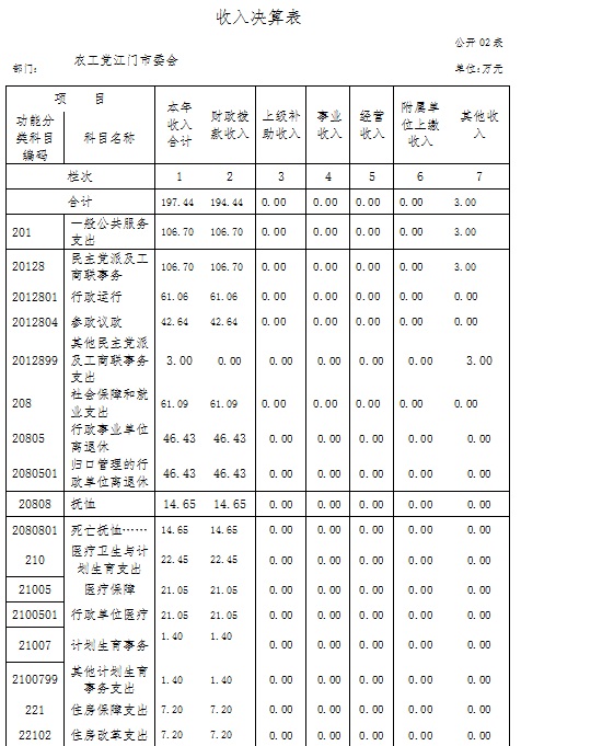 农工党江门市委会2015年度总收入197.44万元,其中本年收入197.44万元。具体情况如下: