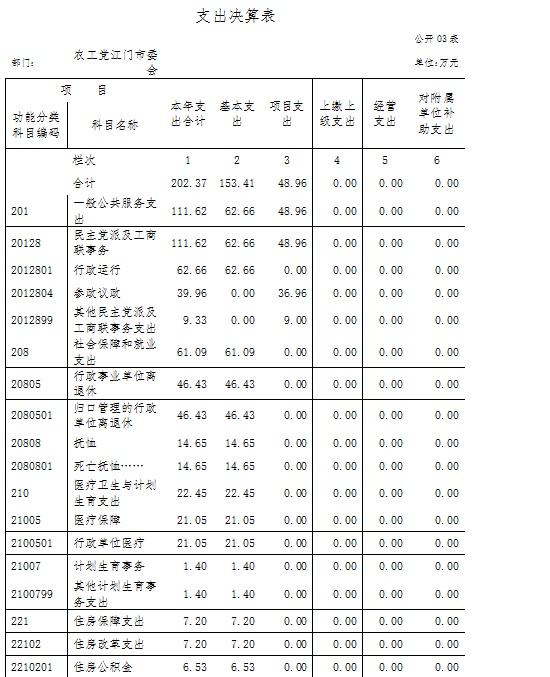 农工党江门市委会2015年度总支出202.37万元,其中本年支出202.37万元。具体情况如下: