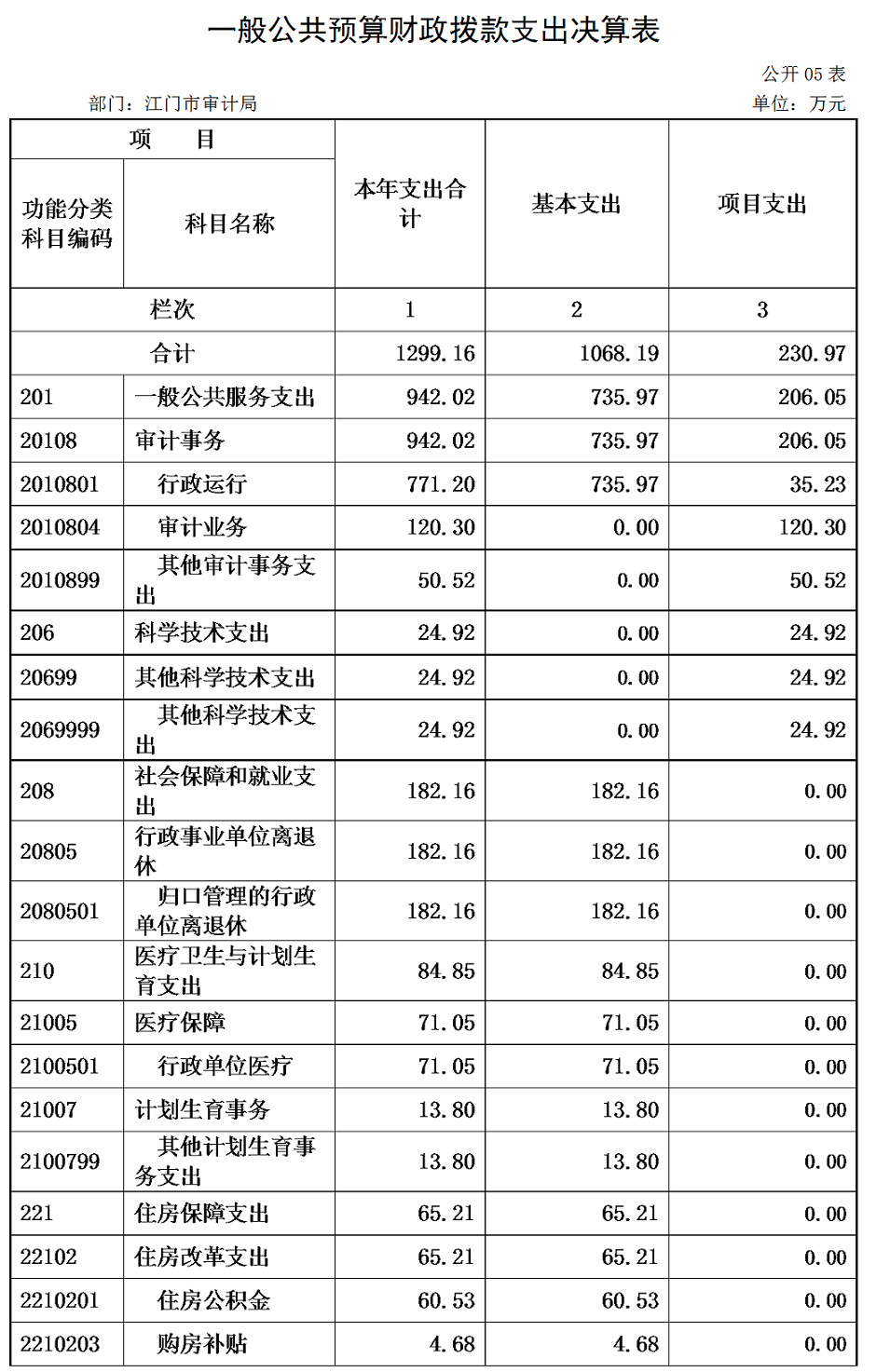 江门市审计局2016年度一般公共预算财政拨款支出1299.16万元,具体情况如下: