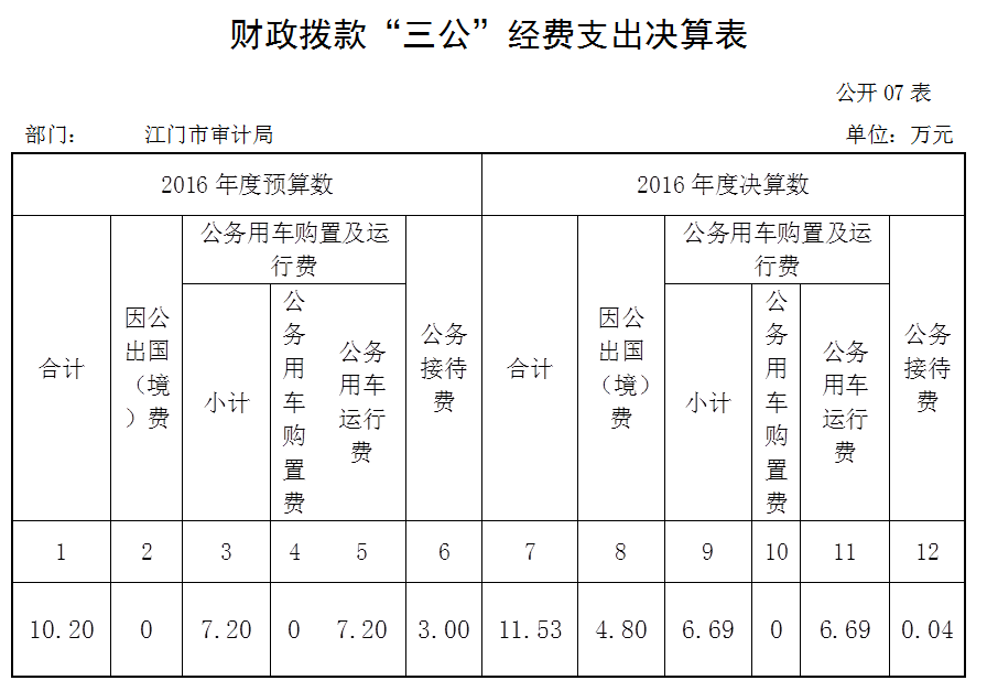 江门市审计局2016年度“三公”经费财政拨款支出决算为11.53万元,完成预算10.20万元的113.04%。其中:因公出国(境)费支出决算为4.80万元,预算为0;公务用车购置及运行维护费支出决算为6.69万元,完成预算7.20万元的92.92%;公务接待费支出决算为0.04万元,完成预算3万元的1.33%。2016年度“三公”经费支出决算大于预算数的主要原因是因公出国(境)经费不列入本部门年初预算反映,在预算执行过程中,对经市外事管理部门审核同意安排出访的市直单位,由市财政部门在因公出国(境)经费总控制数的额度内统筹安排给出访单位使用,在决算时再按照实际使用情况归口到资金使用单位。