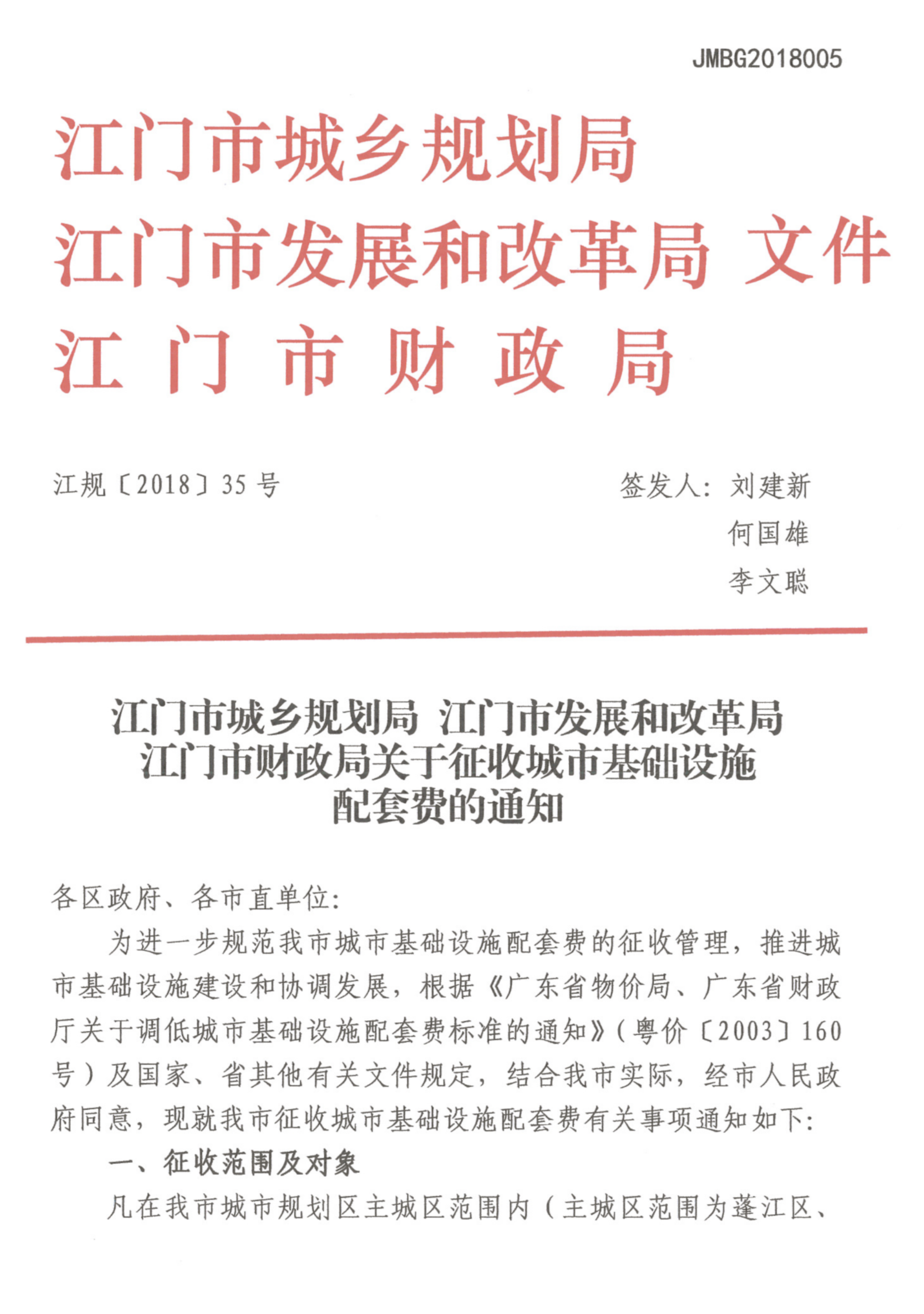 【已废止】江门市城乡规划局 江门市发展和改革局 江门市财政局关于征收城市基础设施配套费的通知 江规〔2018〕35号