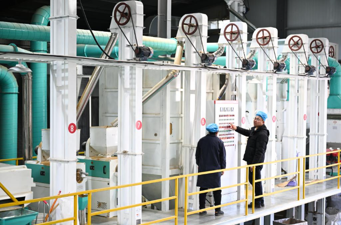 2025年1月10日,“95后”返乡创业大学生任宏宇(右)在陕西省榆林市米脂县米森农业发展有限公司的生产车间与工人交流设备运行情况。新华社记者张博文 摄