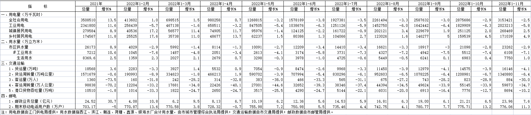 2022年11月用电、用水及运输邮电