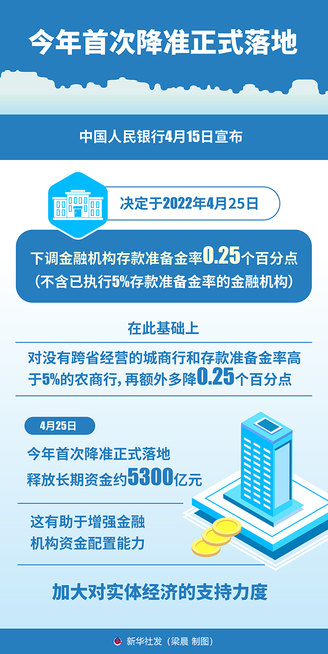 中国人民银行4月15日宣布,决定于2022年4月25日下调金融机构存款准备金率0.25个百分点(不含已执行5%存款准备金率的金融机构)。在此基础上,对没有跨省经营的城商行和存款准备金率高于5%的农商行,再额外多降0.25个百分点。