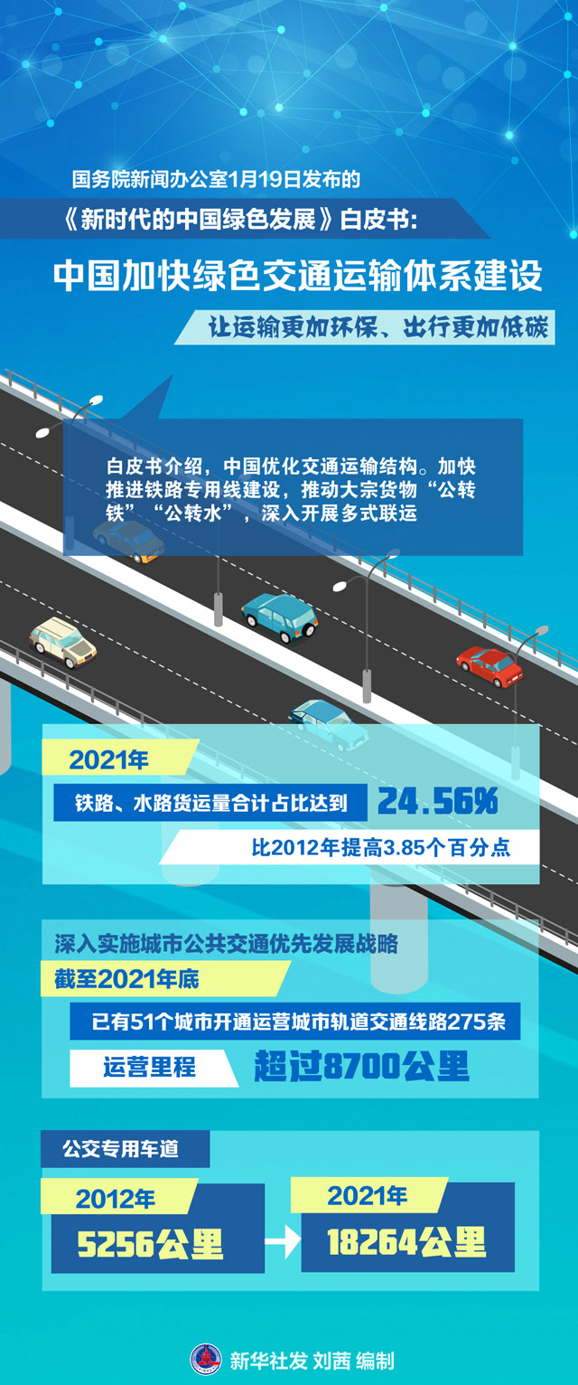 国务院新闻办公室1月19日发布的《新时代的中国绿色发展》白皮书指出,中国加快绿色交通运输体系建设,让运输更加环保、出行更加低碳。