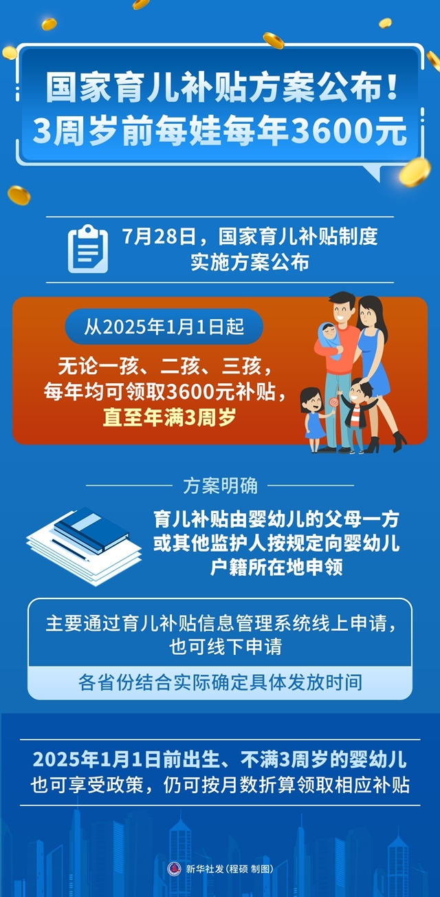 7月28日,国家育儿补贴制度实施方案公布,从2025年1月1日起,无论一孩、二孩、三孩,每年均可领取3600元补贴,直至年满3周岁。