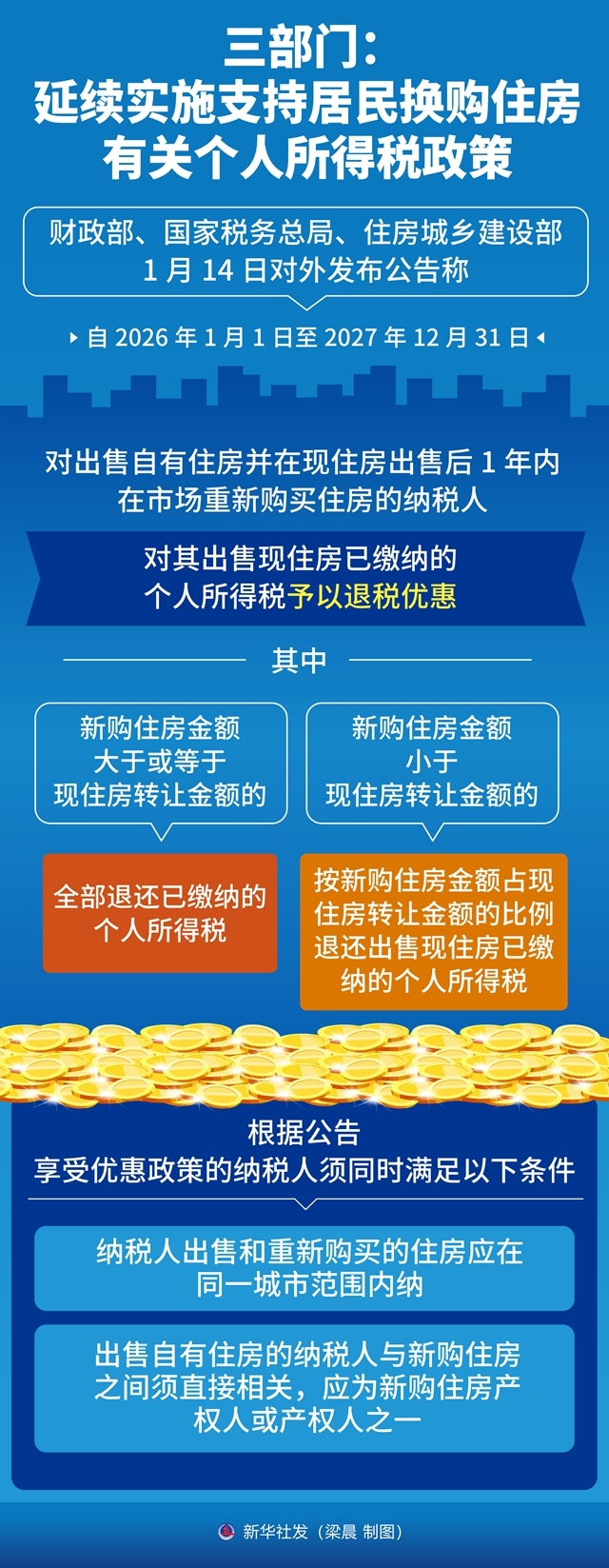 为继续支持居民改善住房条件,财政部、国家税务总局、住房城乡建设部1月14日对外发布公告称,自2026年1月1日至2027年12月31日,对出售自有住房并在现住房出售后1年内在市场重新购买住房的纳税人,对其出售现住房已缴纳的个人所得税予以退税优惠。
