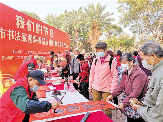 江门日报讯 (文/图 记者/严建广) 近日,由市文明办、市文联主办的“我们的节日—2021年江门市书法家迎春挥毫义赠春联志愿服务活动”在东湖公园北门举行。
