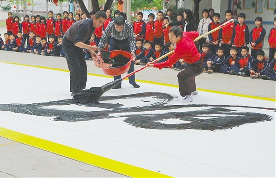 在该校音乐老师弹奏的悠扬古筝声中,江门市著名书法家、江海区书法协会副主席冯才基现场挥毫,在全校师生面前书写“文明江门”巨幅书法作品。冯才基手握巨型茅龙笔,身体随字的走势有节奏地舞动,一气呵成地写出“文明江门”4个大字,赢得了该校师生的阵阵掌声。随后,该校师生纷纷拿起笔,在“创建文明城市,共建美好校园”签名墙上写下自己的名字,承诺将以实际行动支持江门创建文明城市。