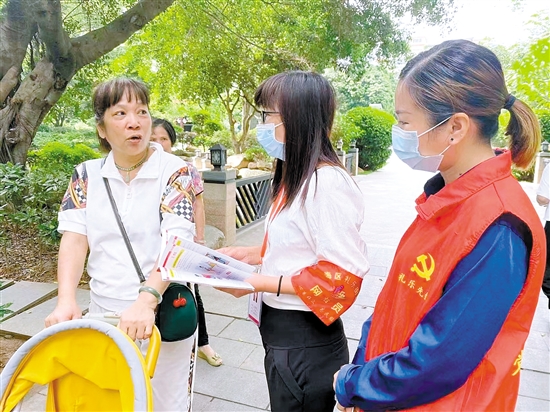 江海区社区网格员为市民介绍文明城市创建相关知识。陈婵 摄