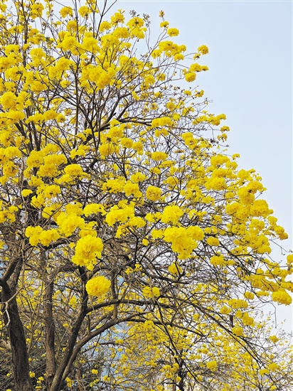 市区建设二路一侧盛开的黄花风铃木。郭永乐摄