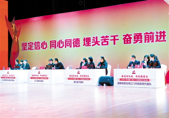 “党的二十大报告指出,坚持科学执政、民主执政、依法执政……”主持人刚念完题目,抢答器发出“3、2、1,开始”的声音,江门市宣传文化系统代表队选手便按下抢答器并回答说“民主集中制!”在1月17日举行的江门市“学习强国”党的二十大精神知识PK赛决赛现场,选手们八仙过海、各显神通,精彩的回答不时赢得观众阵阵掌声。