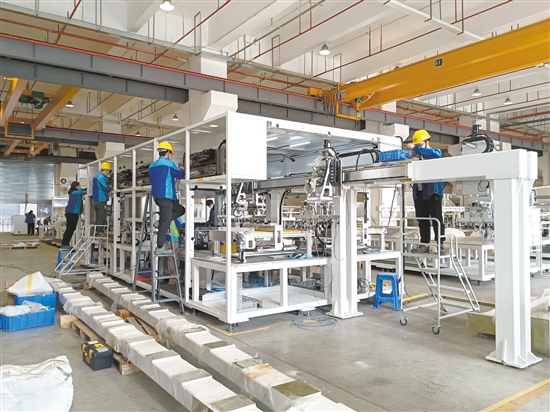 组装、调试、检测……海目星车间工作人员正在加紧调试生产设备,开足马力赶订单。“今年1月份订单较往年有不少增长。根据生产进度,每个人的任务都非常明确,大家干得热火朝天,确保如期交货!”张升负责的车间主要生产新能源激光高端装备——全自动转接片焊接机。