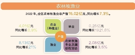 2022年,根据江门市地区生产总值统一核算结果,2022年蓬江区实现地区生产总值870.92亿元,同比增长3.4%,总量在全市排名第二。其中,第一产业增加值7.39亿元,同比增长7.4%;第二产业增加值330.69亿元,同比增长3.4%;第三产业增加值532.84亿元,同比增长3.3%。