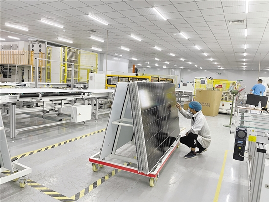 鹤山正充分发挥自身资源禀赋优势,加快推进广东(江门)硅能源产业基地鹤山园区规划建设。图为广东晶镁光能有限公司光伏组件生产现场。