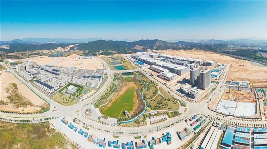 →新会智造园凤山湖园区全景,右为中创新航江门基地项目。 郭永乐 摄