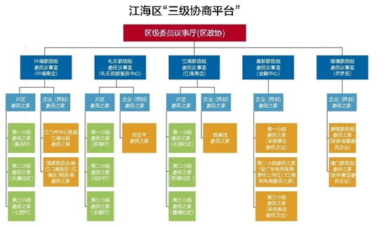江海区政协充分利用各街道、村(社区)现有的公共服务资源进行整合建设,按照“1+5+N”的模式,由江海区委全力推动、江海区政协全面统筹、江海区政协联络组具体组织、部分江海籍市政协委员和全部区政协委员参与,通过一级平台委员议事厅、二级平台委员议事室、三级平台委员之家协同发力,打造政协协商与基层协商的全方位衔接、委员下沉基层、人民群众广泛参与的协商阵地。截至目前,“三级协商平台”已建成区级委员议事厅1个、街道(联络组)委员议事室5个、村(社区)委员之家22个。