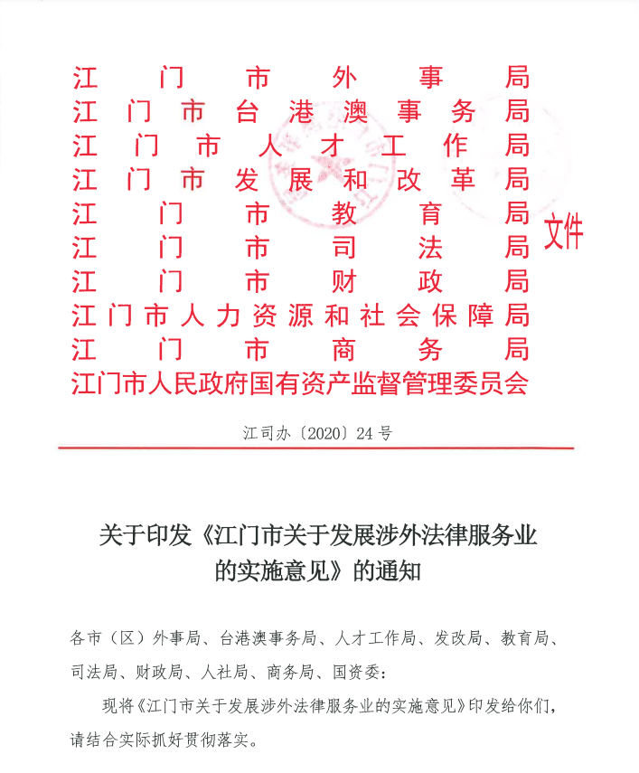 江门市委市政府高度重视涉外法治建设工作,市委依法治市办和市司法局围绕中心服务大局,贯彻落实市委“1+6+3”工作安排,优化升级粤港澳大湾区法律服务领域交流与合作,强化深江合作、粤港澳合作和中欧合作,为推动新时代侨都高质量发展提供坚强的法治保障。