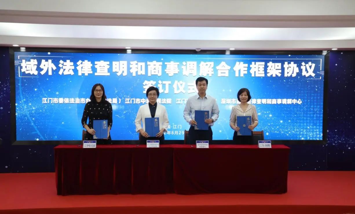 ——携手推出域外法律查明平台服务。联合江门市中级人民法院、江门市人民检察院与深圳市蓝海法律查明和商事调解中心签约共建域外法律查明和商事调解平台合作框架协议并完成补充协商,通过在市公共法律服务中心搭建域外法律查明服务平台链接专线,开启江门市域外法律查明和商事调解合作新进程,为江门企业、人民群众提供法律查明咨询、法律数据信息等一站式、多元化、高效便捷的法律服务。