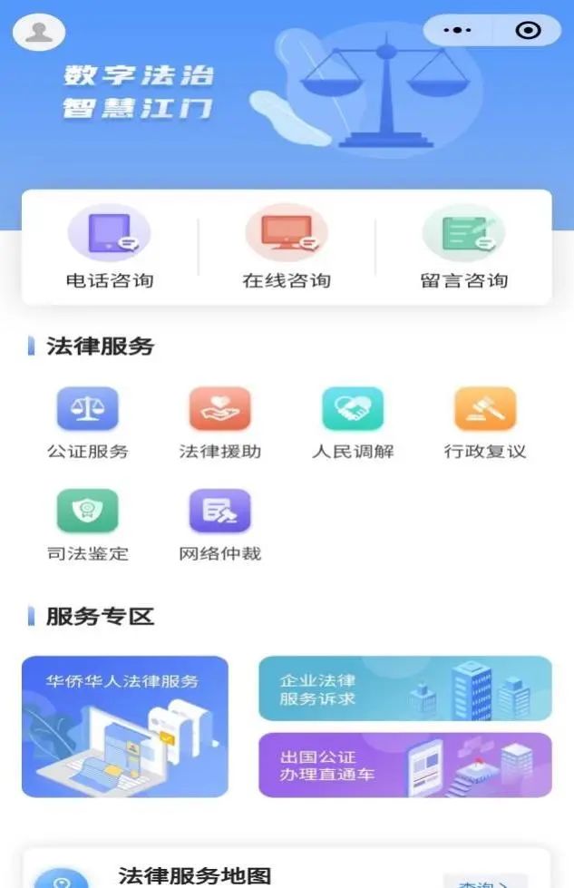 ——科技赋能涉侨公共法律服务。为提高涉侨法律服务智能化水平建设,以数字化信息化科技化建设为引领,构筑起“云端”法律服务网络,先后上线“江门智慧司法”“江门涉外法律服务地图”微信小程序,开设电话咨询、在线咨询、留言咨询;提供公证服务、法律援助、人民调解、行政复议、司法鉴定、网络仲裁等6种法律服务在线申办服务。通过自主研发打通法律服务时空脉络,第一期已上线引入全球85个法律服务点的导航指引,法律服务导航持续更新,截至目前,“江门涉外法律服务地图”涵盖16个类别、近4350个法律服务机构及个人,方便群众便捷地查询到最近身边的法律服务地点。