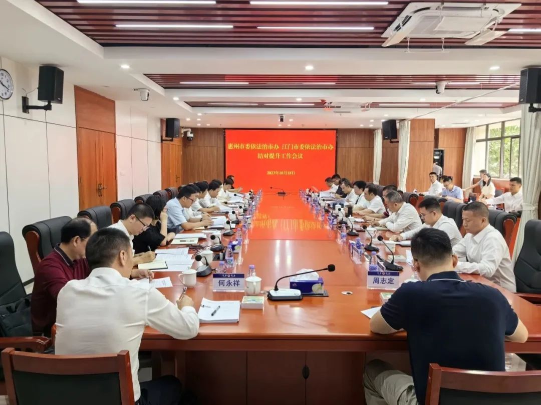 为贯彻落实省委依法治省办《广东省各地级以上市党委全面依法治市委员会办公室结对提升工作方案》部署要求,进一步加强与惠州市开展法治建设结对提升工作,10月17日至18日,江门市委常委、政法委书记、市委依法治市办主任林小龙率调研组赴惠州市开展法治建设结对提升和学习交流。惠州市委常委、政法委书记、市委依法治市办主任黄维玉,市委政法委常务副书记陈裕瑾,市司法局党组书记、局长潘如新等参加有关活动。