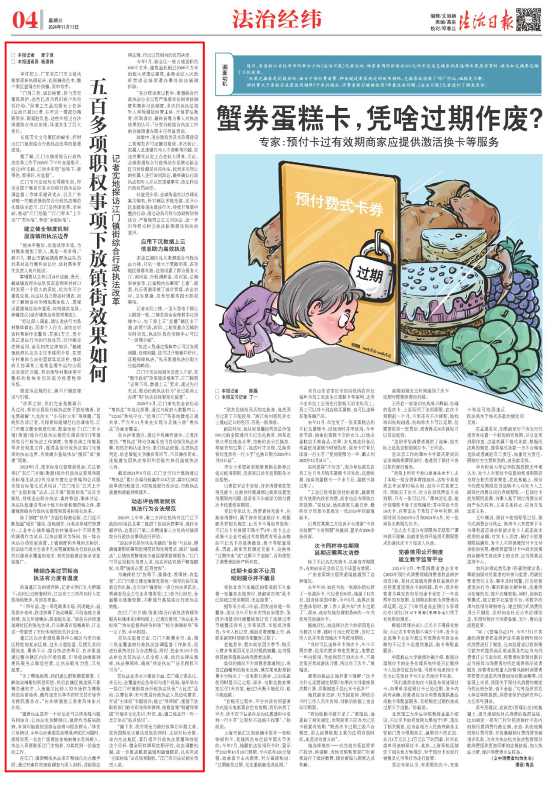 (图为:2024年11月13日法治日报对江门镇街综合行政执法职权下放工作专题报道)
