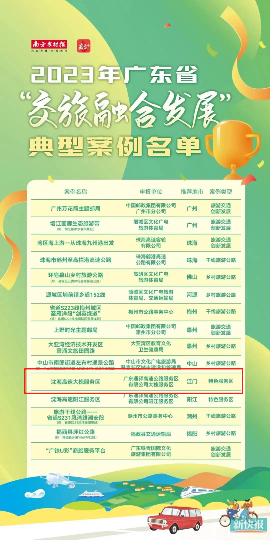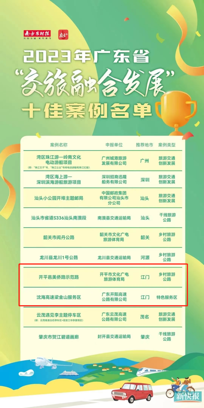 近日,省文化和旅游厅、省交通运输厅,省邮政管理局、中国民用航空中南地区管理局、中国铁路广州局集团有限公司、南方报业传媒集团联合公布了2023年广东省“交旅融合发展”十佳案例和典型案例名单。我市开平邑美侨路示范路、梁金山服务区入选十佳案例,恩平大槐服务区入选典型案例。