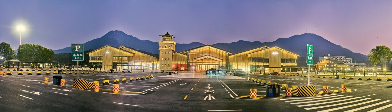 梁金山服务区位于沈海高速K3169(开阳高速江门段),总用地面积360多亩,建筑面积超3万平方米,设有停车位近1300个,是目前广东占地面积最大的服务区,也是以侨乡文化为主题的特色服务区。